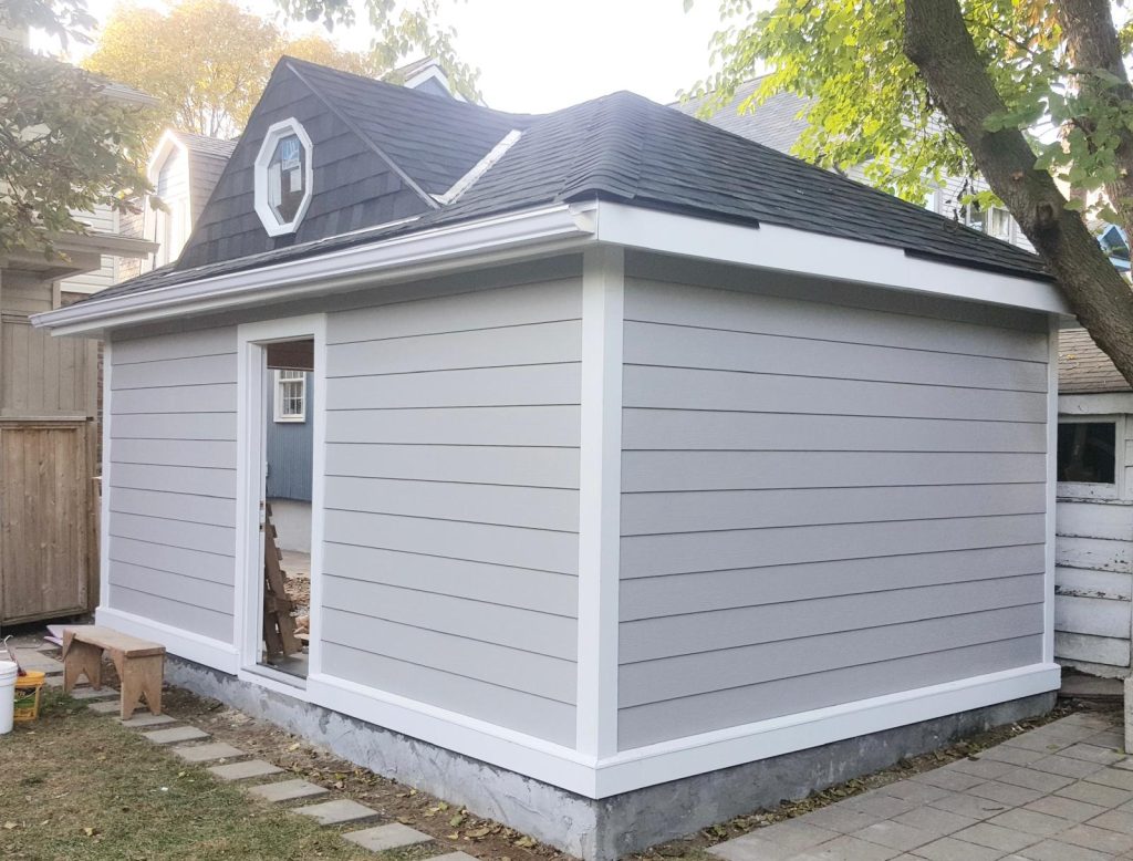 detached garage with pitched roof to match the house design Site located in east side of downtown Toronto. Coordinatio and team work was key for this project due to its tight location and one way street access which made it challenging task